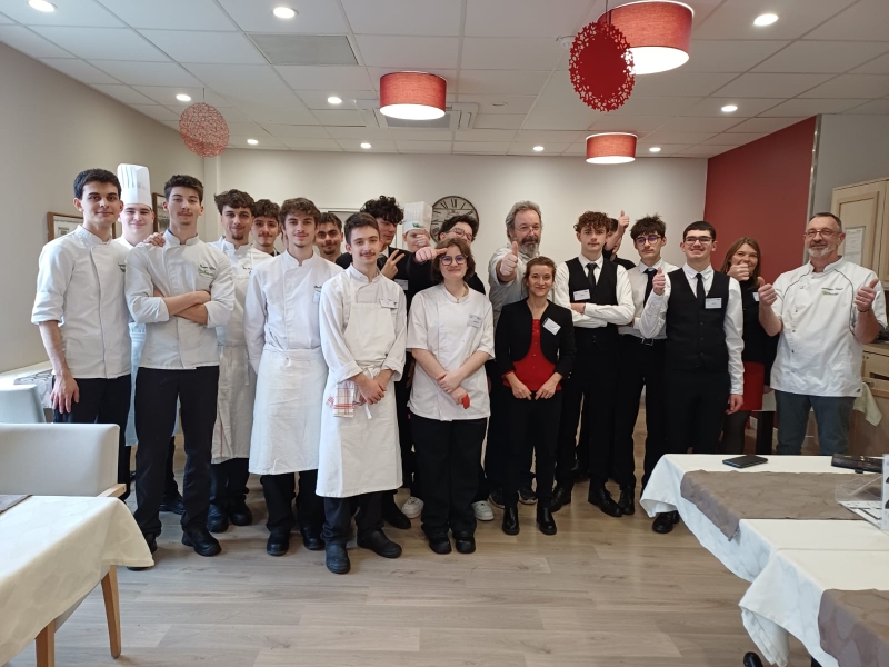 La préparation en amont du repas s’est déroulée dès le début de l’année scolaire avec l’attribution des deux rôles complémentaires à chacune des deux classes : sous la supervision de leurs professeures, Mme Culli et Mme Baraldo, les élèves serveurs de 1ère pro A se chargeaient du service alors que les étudiants de 2e année MHR se consacraient, eux, à la cuisine, sous le contrôle de M. Savonnière et M. Demangeont.