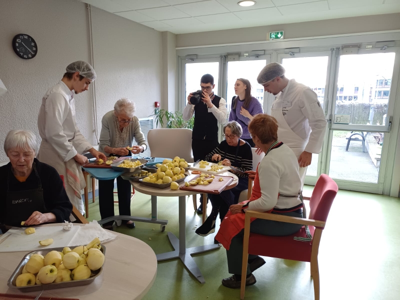 Entre l’installation de la salle par les élèves serveurs sous l’œil des résidents, l’atelier culinaire où les étudiants BTS et certaines personnes âgées préparaient ensemble le dessert, le début du service et le repas en tant que tel, les élèves se relayaient pour prendre des photos de ces différents moments sous différents aspects : portraits, paysages, moments de vie, détails particuliers.