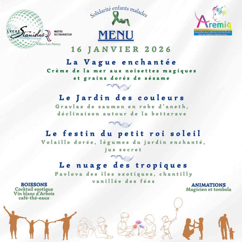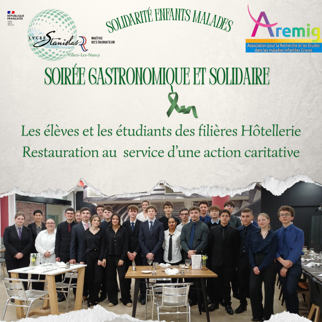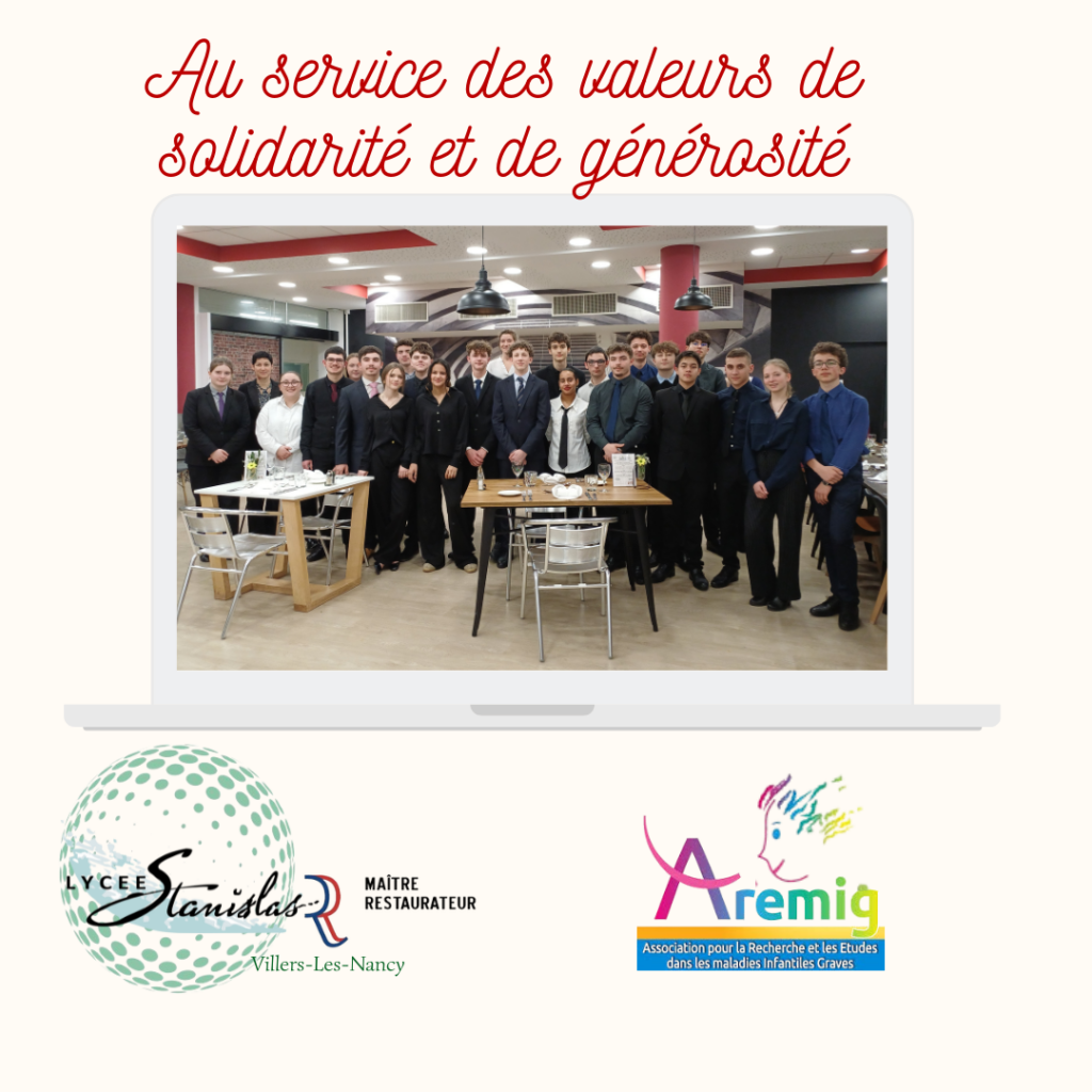 Chaque année, le lycée Stanislas, à travers une opération caritative, met en lumière et participe à une grande cause nationale. Ainsi, cette année, le 16 janvier 2026, nous avons organisé un repas gastronomique solidaire au profit de l’association AREMIG (Association pour la Recherche et les Etudes dans les Maladies Infantiles Graves). Le dîner s’est tenu dans les deux restaurants d’initiation du lycée et les bénéfices de cette soirée seront versés aux responsables de l’association lors d’une petite cérémonie dans les prochaines semaines.