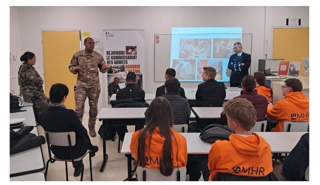 Ainsi, les étudiants en MHR ont été intéressés par le parcours de l’adjudant-chef Nicolas Labache, ancien élève du lycée, à présent Directeur de Production Restaurant de la Base aérienne Nancy Ochey. Ils ont pu aussi découvrir deux parcours au féminin dans cette base militaire : celui du Commissaire Audrey Fourmeaux, Chef du pôle commissariat  et celui  de l’Aviatrice Temarii Aimere, Cuisinière Restaurant.