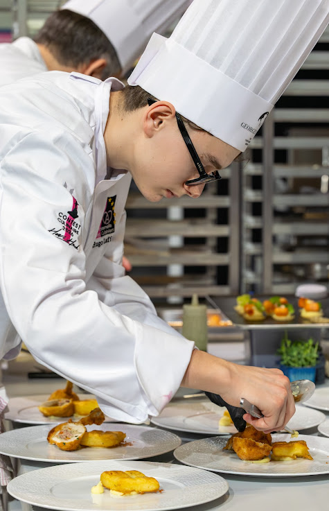 Le jour du Contest, l’équipe a amené le matériel nécessaire pour les trois heures de préparation. De 10h à 13h, c’est avec une grande concentration que les élèves ont réalisé leurs assiettes, s’entraidant et bénéficiant, durant les 30 premières et dernières minutes, du soutien professionnel de leur parrain de l’évènement, le chef Jérôme Amory.
