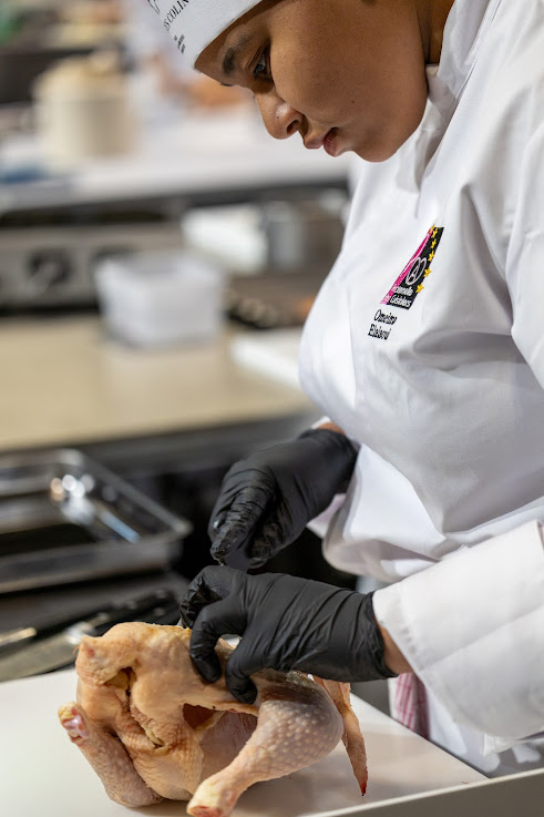 Encadrés par M. Bernaud, leur professeur de Technologie culinaire, ils ont créé deux recettes interprétant l’attendu du Contest : une volaille farcie et une pavlova version street food. Omeima El Alaoui s’est chargée de la réalisation du plat consistant en un poulet farci au fuseau lorrain agencé en écusson, tandis qu’Hugo Laffont s’occupait du dessert imaginé en un tacos de meringue française fourrée de compotée de clémentine à la chantilly parfumée à la bergamote. Leur idée était de mettre en valeur la Lorraine dans l’assiette.