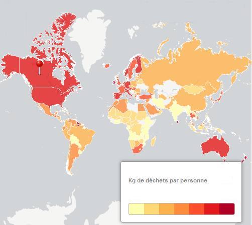 Une observation : Plus le pays est coloré en rouge, plus la production de déchets est importante.