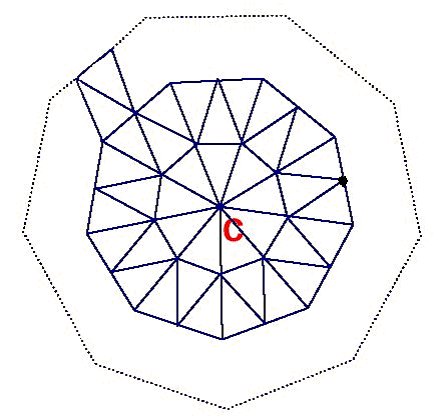 Erwin réalise un pavage à l’aide de triangles tous identiques. Il commence à assembler 9 triangles autour d’un point C comme sur la figure ci-contre. Ensuite, il entoure ces neufs triangles par une couronne d’autres triangles puis il décide d’ajouter une autre couronne dont le pourtour est indiqué en pointillé. Combien aura-t-il utilisé de triangles au total, lorsque son pavage sera terminé ?