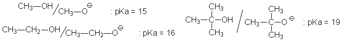 Ce sont essentiellement les effets donneurs du CH3 qui expliquent laugmentation du pKa lorsque lon passe du méthanol à léthanol. Ils permettent également dexpliquer la forte basicité de lanion tertiobutylate, mais il faut voir dans ce pKa élevé, limpossibilité qua le solvant (le tertiobutanol), de solvater cet anion à cause de lencombrement stérique. Cet anion sera donc extrêmement instable et le tertiobutanol est un des alcools les moins acides.