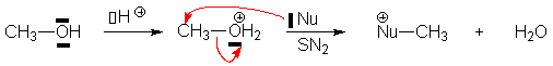 Aussi faut-il transformer cette fonction alcool en une nouvelle structure devenue un bon groupe partant. On utilise principalement deux méthodes : la transformation de l'alcool en ester de l'acide sulfonique (sulfonate) ou la protonation en milieu fortement acide. La dernière méthode est de loin la plus importante, mais la première est de plus en plus utilisée car elle permet la réactivité des alcools en milieu anhydre. La nature du substrat (primaire, secondaire ou tertiaire) influencera la vitesse et l'ordre de la SN de la même manière qu'il influence les SN sur les dérivés halogénés.