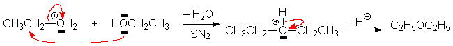 Un autre type de nucléophile est lalcool lui-même. La réaction se fait à température modérée (à lébullition de lalcool en présence dacide sulfurique). On obtient un oxyde dalkyle, symétrique si lon ne fait réagir quun seul type dalcool :