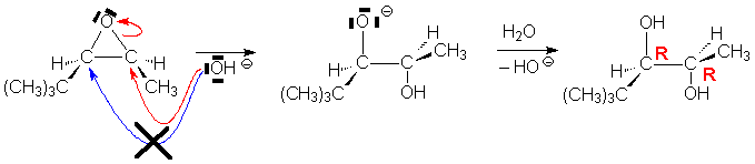 Les éthers sont habituellement inertes en milieu basique. Cest pour cela quils servent souvent de solvant dans les réactions nucléophiles (organomagnésiens) ou basiques. Cependant, les époxydes (ou oxirannes, ou oxacyclopentanes), peuvent être clivés par les nucléophiles forts. Cette réaction respecte les règles de régiosélectivité (site le moins encombré) et de stéréochimie des SN2 :