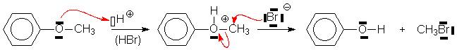 Il y a protonation de loxygène, et SN2 (généralement) de I ou Br sur le carbone le plus accessible. Ceci est particulièrement vrai pour les éthers aromatiques (lanisole ou méthoxybenzène par exemple), qui sont généralement préparés pour protéger un phénol lors dune réaction sur le cycle aromatique :