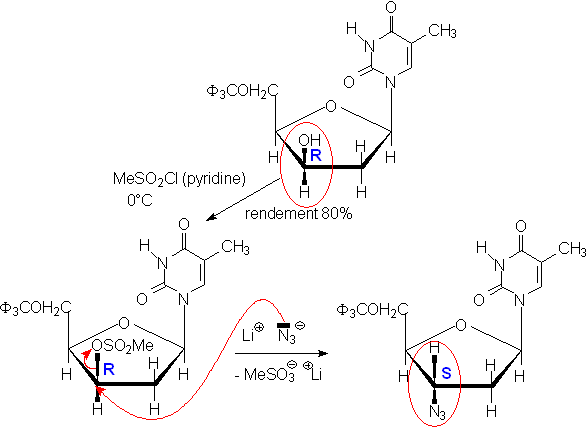 Dans l'exemple ci-contre, au final, la fonction alcool est transformée en fonction azoture, avec inversion de configuration (SN2 dans la seconde étape).