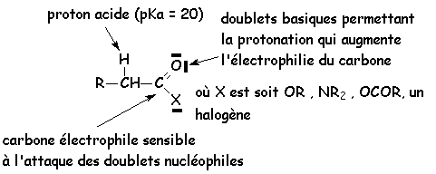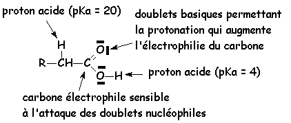 Sur les schémas suivants, on voit les principaux sites réactionnels des acides et de leurs dérivés :