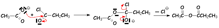 Les anhydrides sont aussi obtenus par réaction des ions carboxylates sur les chlorure d’acide. Cela permet l’obtention d’anhydrides mixtes :