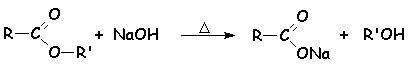 Cette réaction chimique est une des plus anciennement utilisée, puisqu’elle permet la synthèse des savons. L’ester est transformé à chaud de manière irréversible en carboxylate de sodium ou de potassium (le savon) et en alcool :