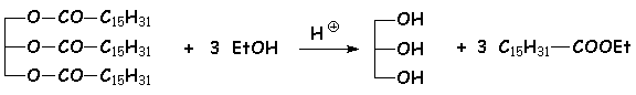 Les esters peuvent être transformés en d’autre esters, par chauffage avec un excès d’alcool différent en milieu acide. Cette réaction permet par exemple de transformer les esters glycériques en esters éthyliques :