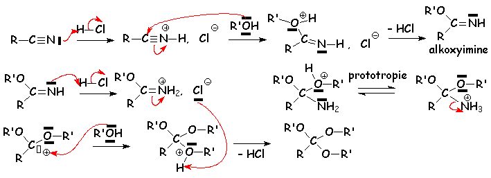 Une mole d’alcool réagit avec une mole de nitrile en présence de gaz chlorhydrique sec pour donner un ester. Par contre, trois moles d’alcool donneront, toujours avec une mole de nitrile dans les mêmes conditions, un orthoester RC(OR’)3 :