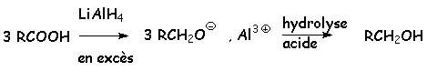 Le tétrahydruroaluminate de lithium LiAlH4 donne le même composé intermédiaire, mais, lorsque celui-ci ne précipite pas, LiAlH4 va réduire le carboxylate en alcoolate, il y a donc formation d’alcool après hydrolyse :