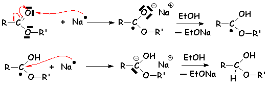 Les esters sont réduits par le sodium de manière radicalaire. En présence de protons, tels que ceux amenés par le solvant non aqueux qui peut être l’éthanol, ils sont réduits en deux alcools, comme dans la réaction précédente :