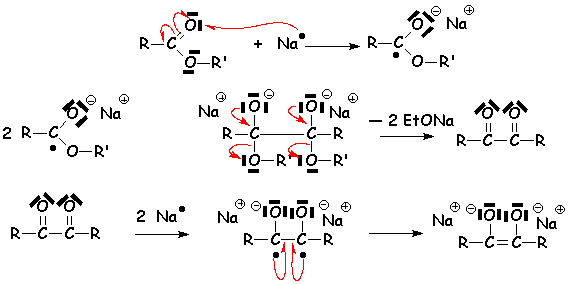 Si l’ester réagit avec le sodium en l’absence de solvant protique (dans le toluène par exemple), une duplication a lieu (voir la duplication réductive des cétones par les métaux). On obtient des acyloïnes, composé carbonylé a-hydroxylé :