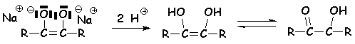 Lors de l’hydrolyse acide qui suit, les oxoanions sont protonés et le composé se tautomérise en acyloïne :