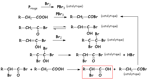 Le Phosphore rouge est en quantité catalytique, il réagit avec le brome pour donner PBr3 qui va permettre de créer une faible quantité de bromure d’acyle RCH2COBr. Les effets – I du brome vont augmenter l’acidité des H en a du carbonyle, et permettre la formation de l’énol. Comme avec les dérivés carbonylés, il y a alors addition de dibrome, avec élimination d’HBr. Puis les fonctions acide et bromure d’acide s’échange, en régénérant une quantité catalytique de bromure d’acyle :