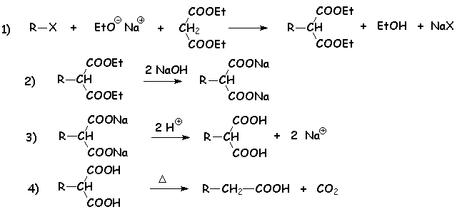 Cette réaction permet de rajouter deux carbones à une chaîne carbonée halogénée, dont un représente une fonction acide carboxylique. La suite des réactions se décrit ainsi :