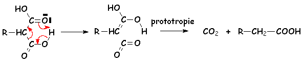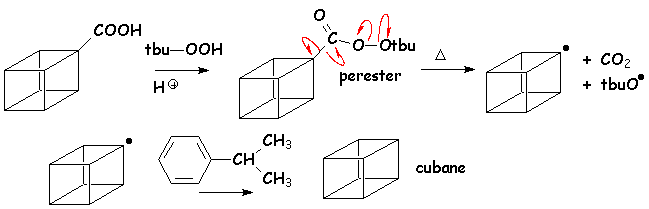 Tous les acides peuvent être décarboxylés par décomposition radicalaire des peresters, obtenus par estérification de l’acide par un hydroperoxyde d’alkyle, dans un solvant donneur de H·, tel que le cumène :