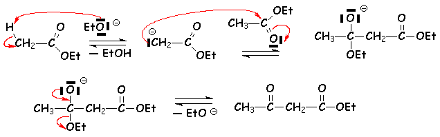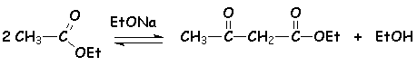 Cette réaction est équilibrée, et la formation de l’acétylacétate d’éthyle est obtenue par distillation de l’éthanol. Si l’on chauffe l’acétylacétate d’éthyle avec un excès d’éthanol en présence d’une quantité catalytique d’éthanolate de sodium, on récupère l’éthanoate d’éthyle de départ. Par contre la saponification de l’acétylacétate d’éthyle suivie de chauffage en milieu acide conduit à une décarboxylation (acide b,g-insaturé). Il se forme la propanone.