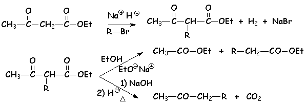 On peut utiliser ces propriétés pour mettre en œuvre une suite de réaction semblable à la synthèse malonique : c’est la synthèse acétylacétique.