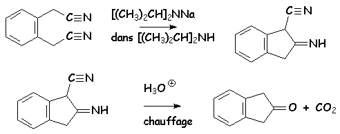 Elle est tout à fait semblable à la Dieckmann. Au lieu du diester, on utilise le dinitrile. Celui-ci est traité par le diisopropylamidure de sodium par exemple, pour donner, dans la diisopropylamine comme solvant, une a-cyanoimine. L’hydrolyse transforme le groupement nitrile en acide carboxylique, l’imine en cétone, et le chauffage simultané permet alors la décarboxylation avec libération de la cétone cyclique :