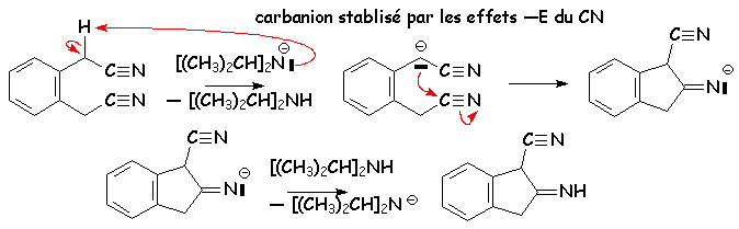 La première réaction débute par l’arrachement du proton porté par le CH2 du propanedioate d’éthyle (appelé malonate d’éthyle). Le carbanion formé est stabilisé par l’addition des effets mésomères et inductifs attracteurs des deux fonctions esters, d’où cette acidité relativement élevée.