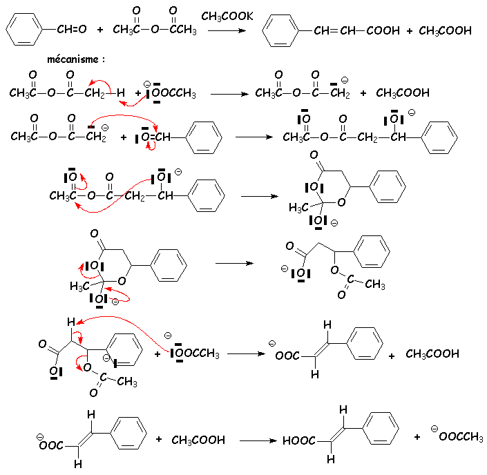 Le benzaldéhyde réagit avec l’anhydride éthanoïque en présence d’ion éthanoate. Les effets attracteurs des deux carbonyles se cumulent pour rendre acide l’hydrogène en a de l’un ou l’autre des C=O :