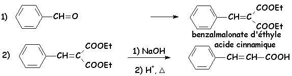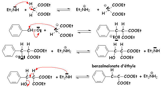Le malonate d’éthyle est suffisamment acide pour qu’une base assez forte telle que la soude ou une amine secondaire est capable de permettre la mise en place de la réaction équilibrée avec le benzaldéhyde qui sera déplacée vers la droite par élimination d’eau et formation d’un composé encore très conjugué :