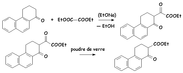 Contrairement aux réactifs précédents, l’oxalate d’éthyle (éthanedioate d’éthyle) ne possède pas d’hydrogène acide. Par contre, la proximité des deux fonctions esters, et de leurs effets attracteurs (inductifs essentiellement), rend le carbone fonctionnel plus électrophile que celui d’un dérivé carbonylé classique. Sur l’exemple suivant, on obtient en milieu éthylate un ester a-carbonyle, que l’on décarbonyle (— CO) ensuite par chauffage sur poudre de verre. Cette réaction sert à fixer un carboxylate d’éthyle en a d’un carbonyle
