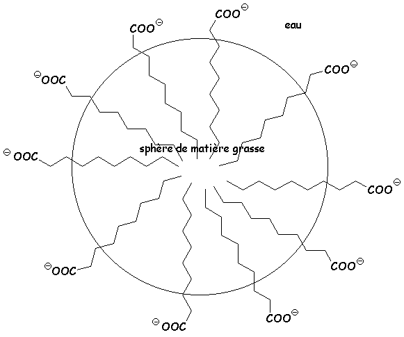 Les savons (carboxylates de sodium ou de potassium), présentent une extrémité hydrophile (la fonction carboxylate, par création de liaison H), et une extrémité lipophile (la chaîne carbonée linéaire).
