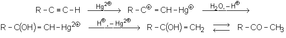 L’addition d’eau et d’acide acétique, acides trop faibles, nécessite un catalyseur : Hg2+ + H2SO4 :