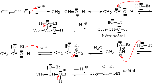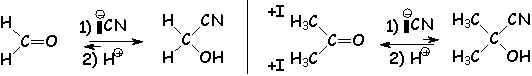 Le premier équilibre a une constante de 10 -6. Cependant L'équilibre global a une constante supérieure à 1, dans le cas des aldéhydes (6 à 10) ; par contre, dans le cas des cétones, cette constante est de L'ordre de 10 -1. Ceci est dû à la plus faible réactivité du carbonyle des cétones (voir la synthèse des cyanhydrines).