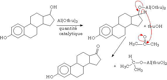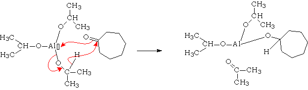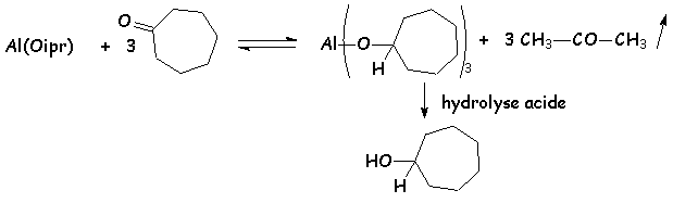 L'isopropylate d'aluminium est un donneur d'ion hydrure peu aggressif. Il servira à réduire des cétones " fragiles ". La réaction est un équilibre entre alcoolates et cétones, L'équilibre étant déplacé par distillation du composé le plus volatil qui est la propanone :