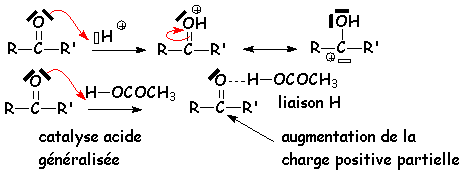 La réaction se fait en présence de protons libres (acides forts) ou d'acides faibles pouvant créer des liaisons hydrogène, tels que les acides carboxyliques (il s 'agit alors de la catalyse acide généralisée) :