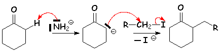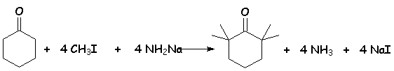 Si L'on mélange en proportions stœchiométriques, de la cyclohexanone, de L'iodure de méthyle et de L'amidure de sodium, on obtient un mélange de cyclohexanones mono- et polyméthylées en a et a ' :