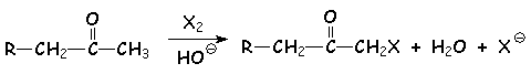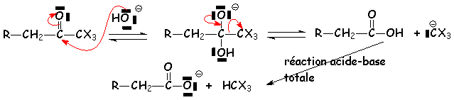 Si la cétone est méthylée, on aboutit à R - CH2 - CO - CX3. Comme nous sommes en milieu basique, ce composé est détruit de la manière qui suit :