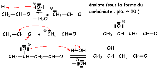 Généralement, à température ordinaire, la réaction s 'arrête à ce stade en milieu basique. Cependant, le chauffage peut favoriser la déshydratation (crotonisation). Celle-ci est difficile, même à chaud, lorsque les structures obtenues sont linéaires.