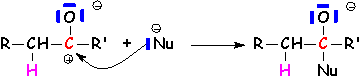 Le nucléophile est assez puissant pour attaquer le premier. Cette réaction se fait dans un milieu qui préserve L'intégrité de ce nucléophile, donc un milieu basique. La protonation se fait généralement lors de L'hydrolyse du composé d'addition obtenu :