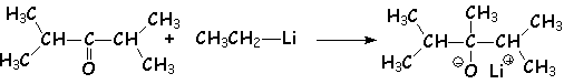 Lorsque les molécules sont encombrées, le comportement des divers organométalliques diffèrent : les organolithiens réagissent selon la norme indiquée plus haut, alors que les organomagnésiens donneront généralement une réduction des dérivés carbonylés encombrés :