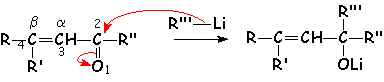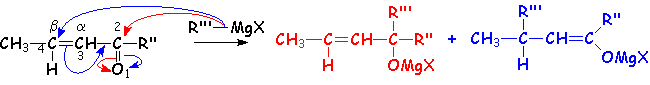 - En fonction de L'encombrement de la position 4, les organomagnésien donneront tantôt une addition 1,2 (pos. 4 encombrée), 1,4 (pos. 4 non encombrée), ou un mélange des deux dans le cas intermédiaire (CH3 n 'est pas très encombrant) :