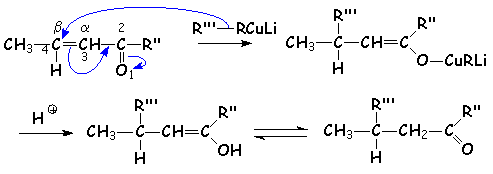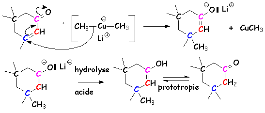 - Pour que L'addition soit uniquement 1,4 " L'encombrement du C4, on a recours aux organocuprates, de formule R2CuLi :