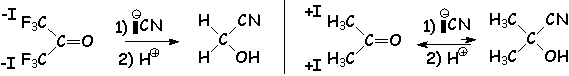 Le dérivé carbonylé sera d'autant plus sensible à L'addition nucléophile que le carbone fonctionnel est pauvre en électron : donc les aldéhydes, qui subissent moins d'effets donneurs que les cétones (voir les effets électroniques des groupes alkyles), seront plus réactifs qu 'elles. Le méthanal est le plus sensible de tous. Si le carbonyle est substitué par des groupements à effet attracteur, ils seront encore plus réactifs.