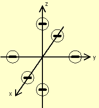 1.1 Modification des niveaux d'énergie des OA d d'un métal sous l'effet d'un champ octaédrique créé par 6 ligands (représentés par 6 charges négatives)