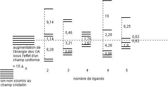 Voici, proportionnelles à la force du champ électrostatique créé par les ligands, les énergies des divers niveaux ”d” apparaissant dans chaque type d'environnement :