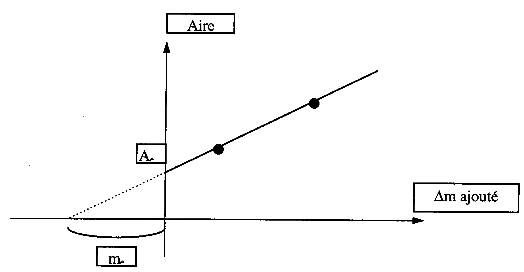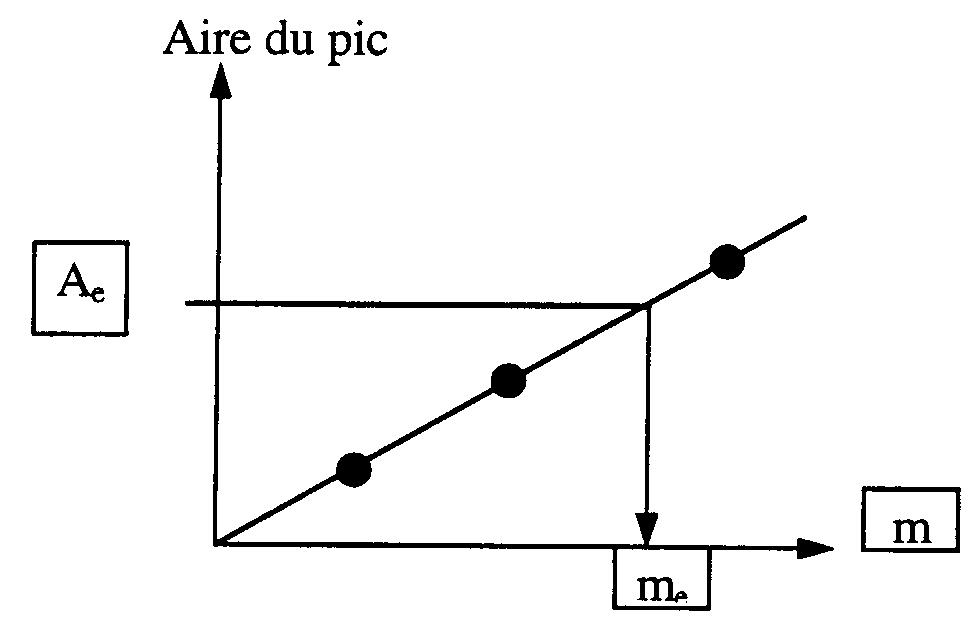 Dans l'échantillon contenant les masses m1, m2, … de solutés on ajoute me de l'étalon, ce qui donne les aires A1, A2, Ae.