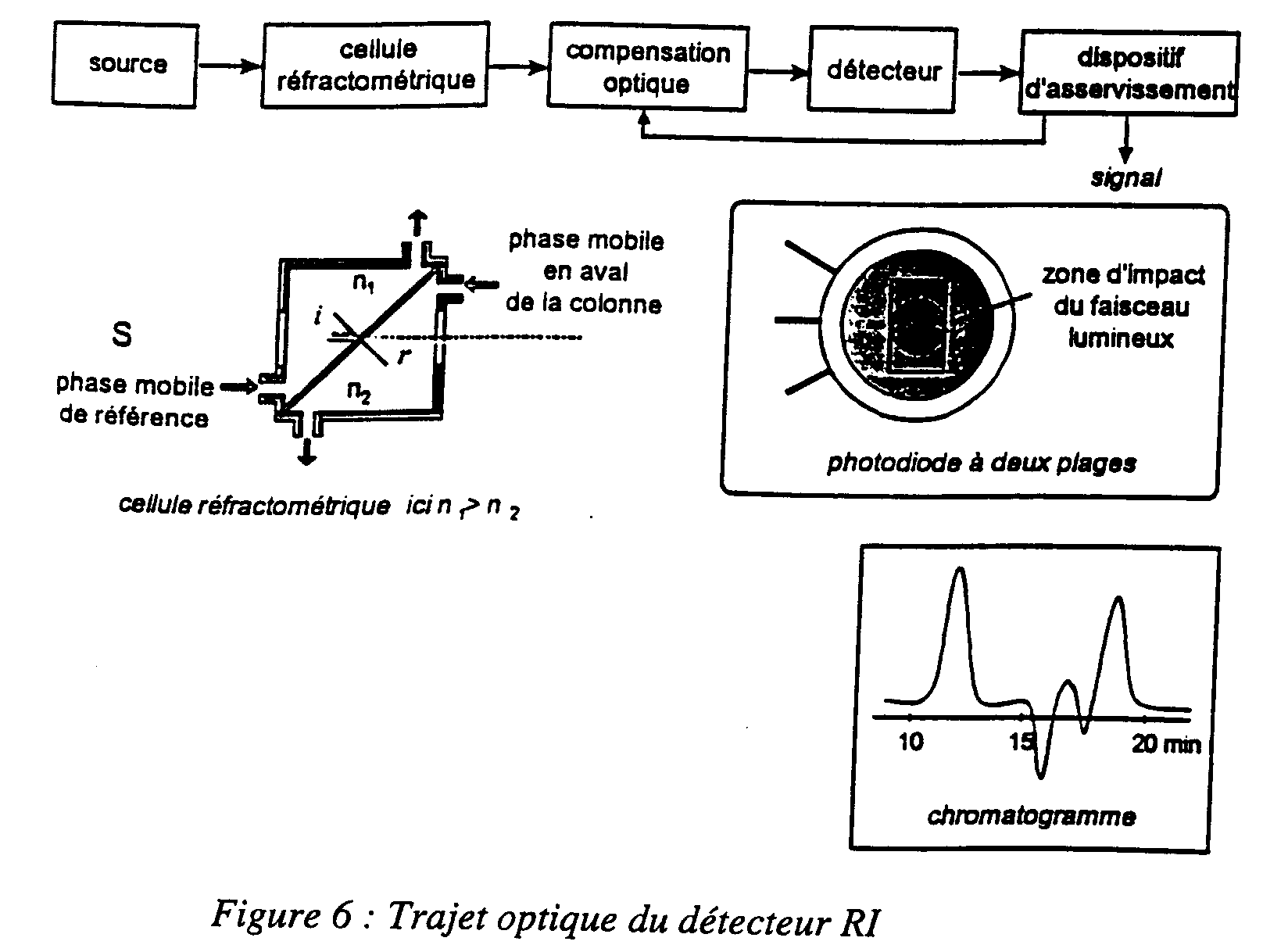 * réfractomètre : il mesure la variation de l'indice de réfraction du liquide à la sortie de la colonne. Cette mesure, extrêmement précise, dépend néanmoins de la température du liquide. On compare cet indice avec celui de la phase mobile pure : il y a donc une référence d'où le terme de variation de l'indice. Ce détecteur exclut les variations de la composition de la phase mobile ; il n'est donc possible de travailler qu'en mode isocratique avec ce détecteur.